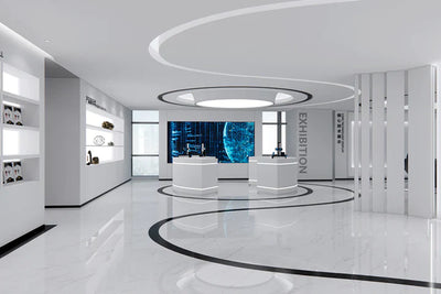 The exhibition hall is expansive, radiating a modern technological ambiance as it showcases the company's diverse product range.