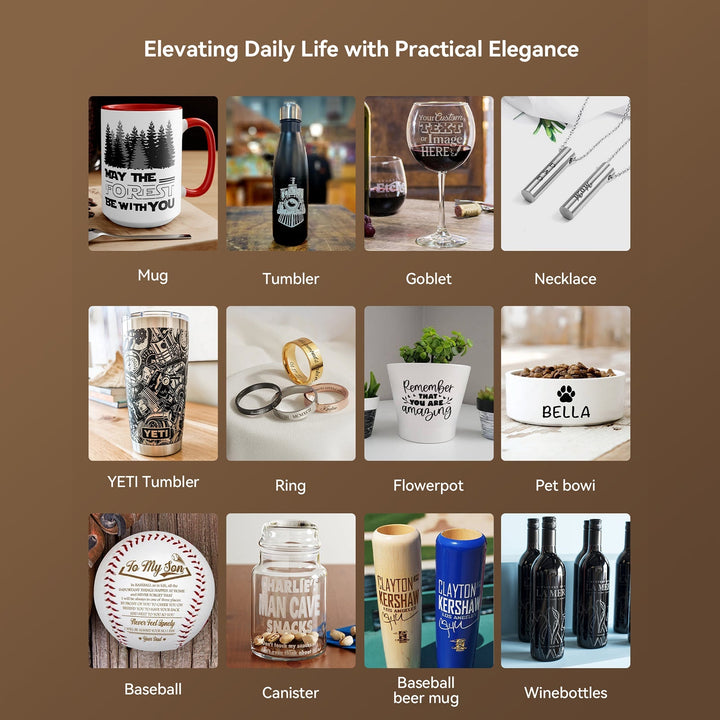 Versatilità migliorata: perfetto per incidere oggetti cilindrici standard o leggermente irregolari, come termos, mazze da baseball e calici da vino.