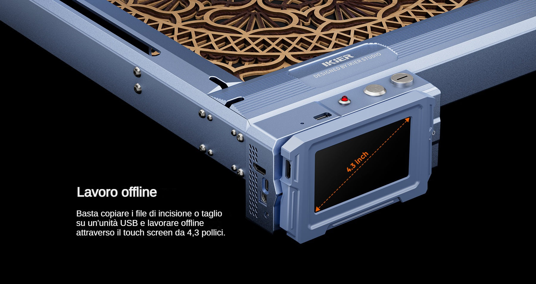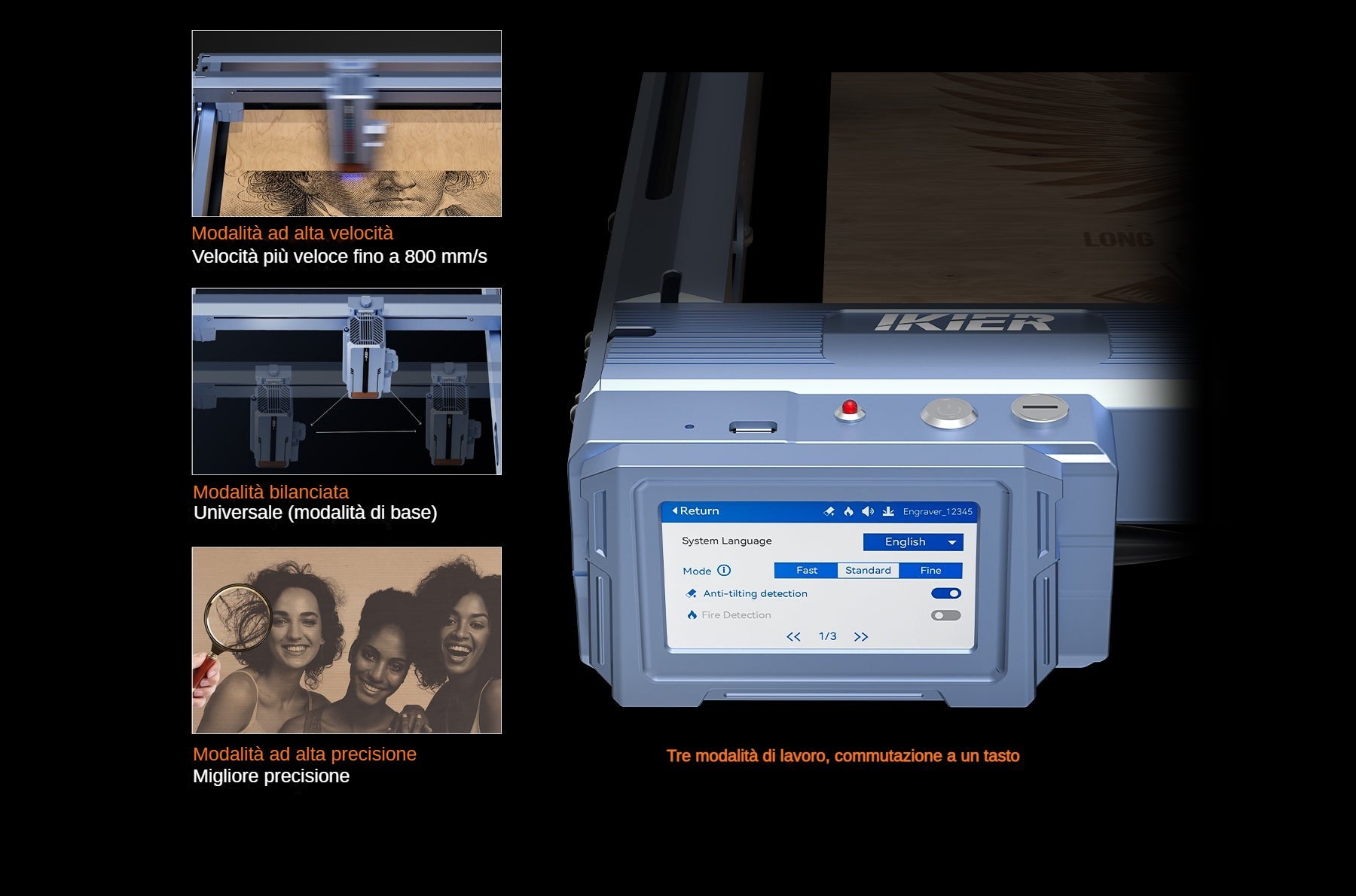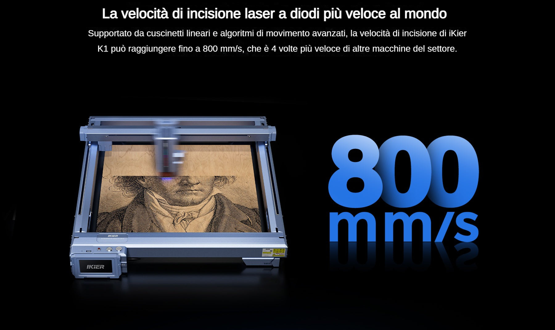 La velocità di incisione di IKIER K1 può raggiungere gli 800 mm/s, 4 volte più veloce di altre macchine del settore. Questa velocità ha già raggiunto il livello più alto dell'industria attuale, massimizzando la vostra produttività al massimo.