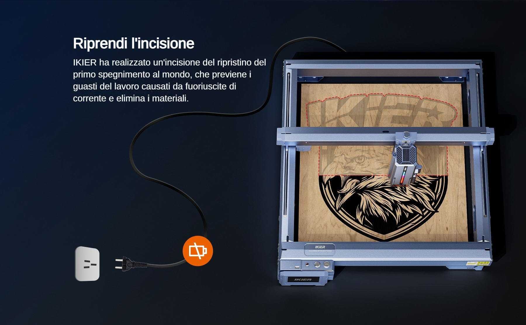 IKIER ha realizzato per prima al mondo la ripresa dell'incisione con spegnimento, che previene le interruzioni di lavoro causate da interruzioni di corrente impreviste ed elimina gli sprechi di materiale.