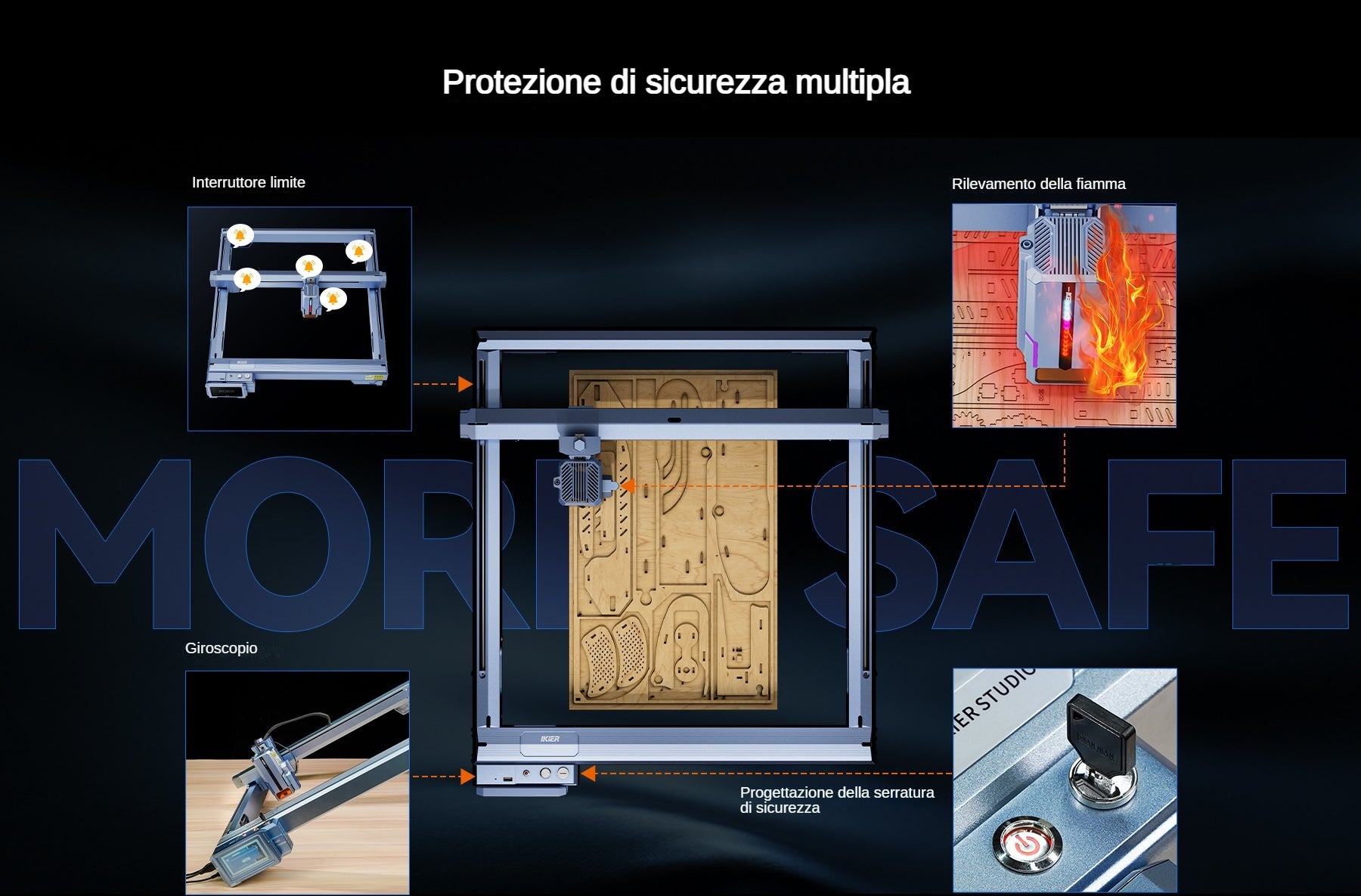 In caso di rilevamento di una fiamma, la macchina emette un allarme e invia una notifica a un dispositivo mobile collegato, mentre il modulo laser torna automaticamente alla sua posizione originale.