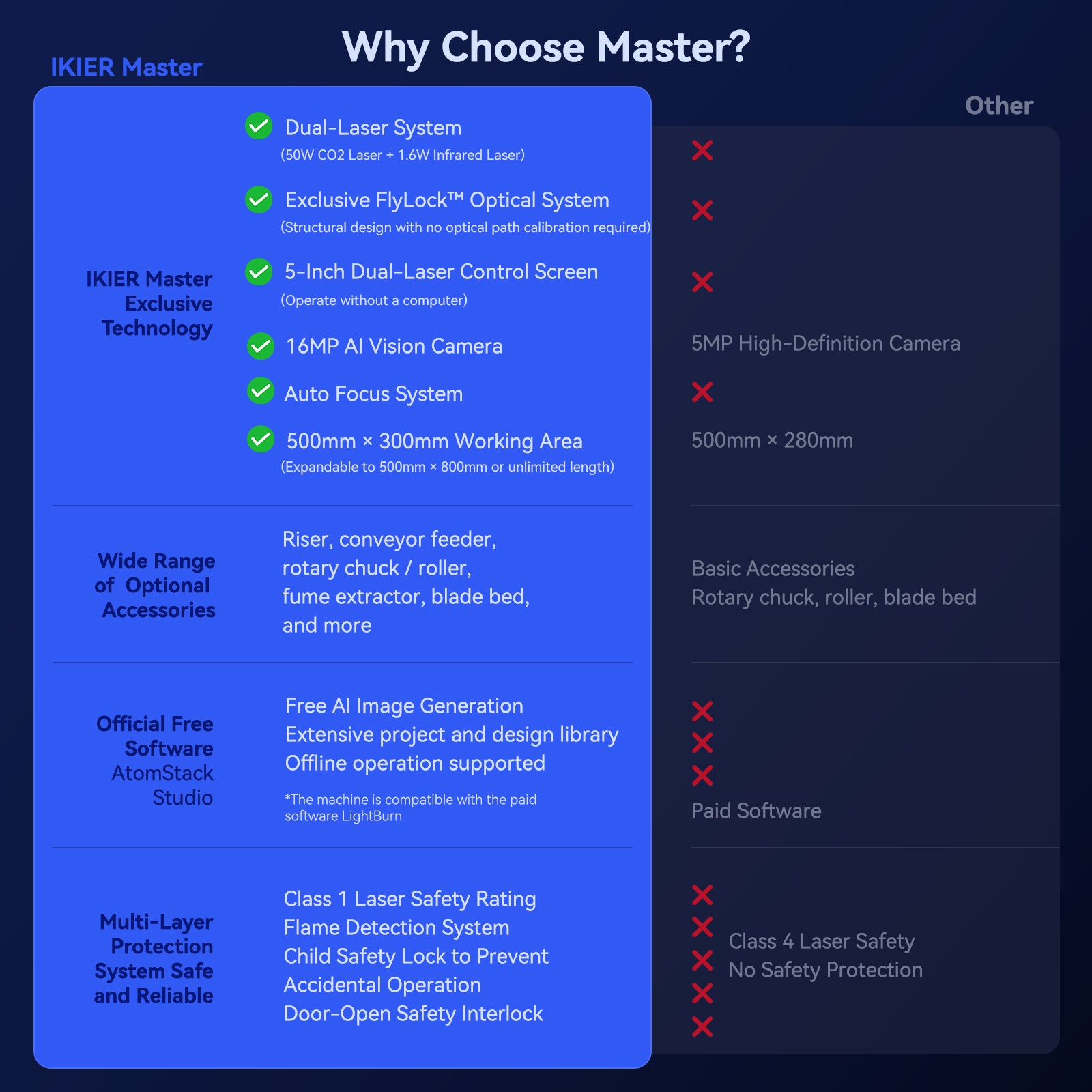 - Doppia potenza laser, massima versatilità: Dotato di un laser CO₂ da 50 W per un taglio potente e di un IR da 1,6 W Laser per incisione precisa su metallo.